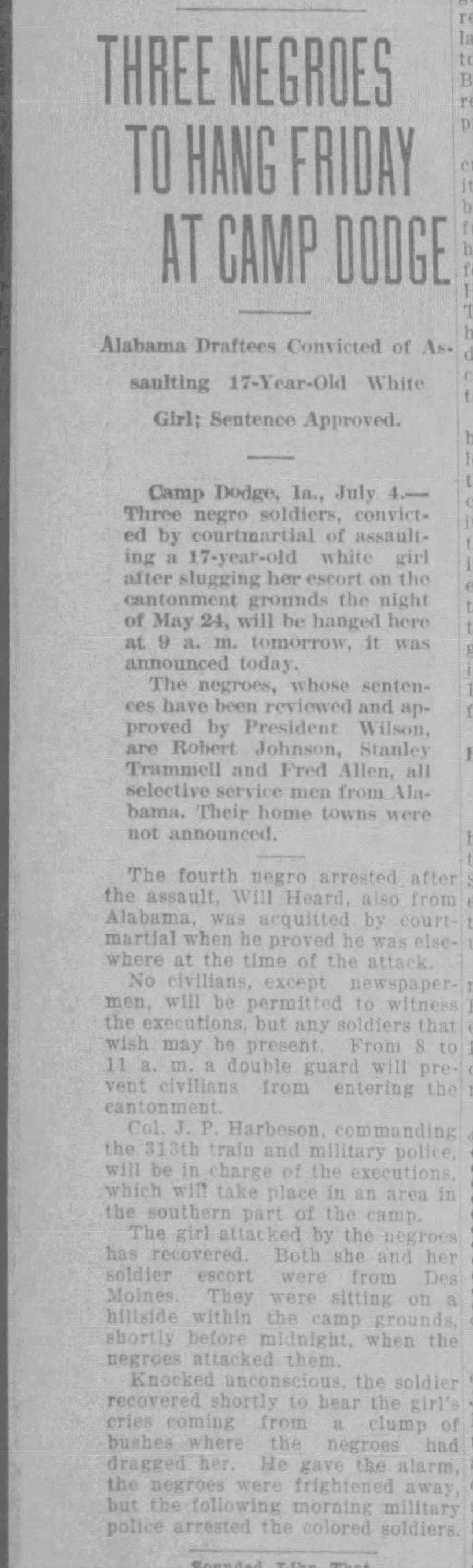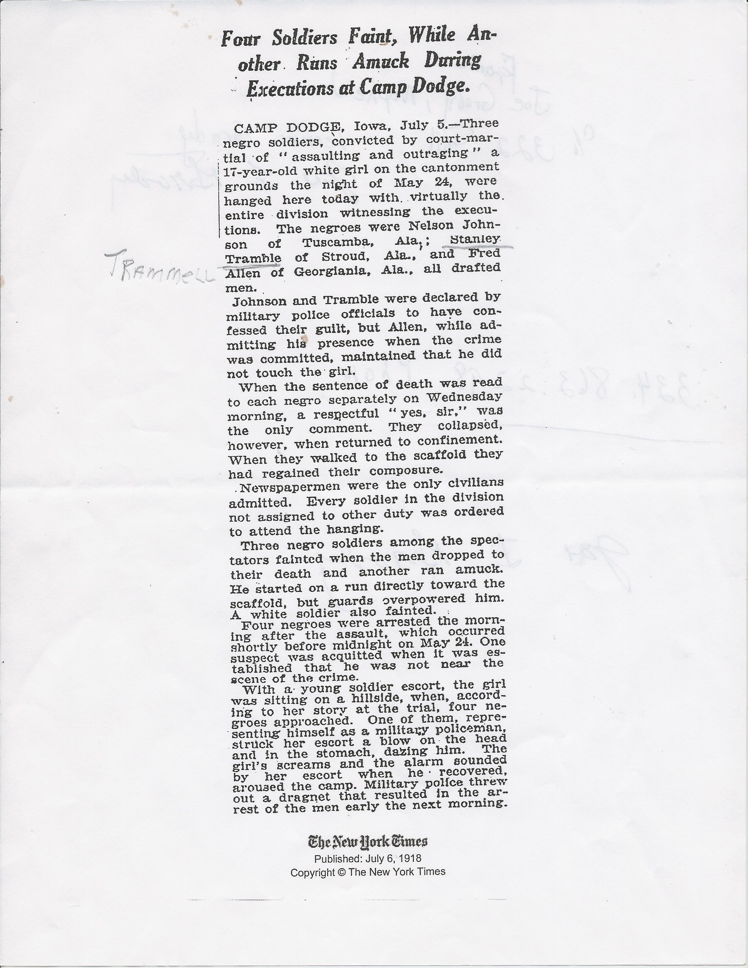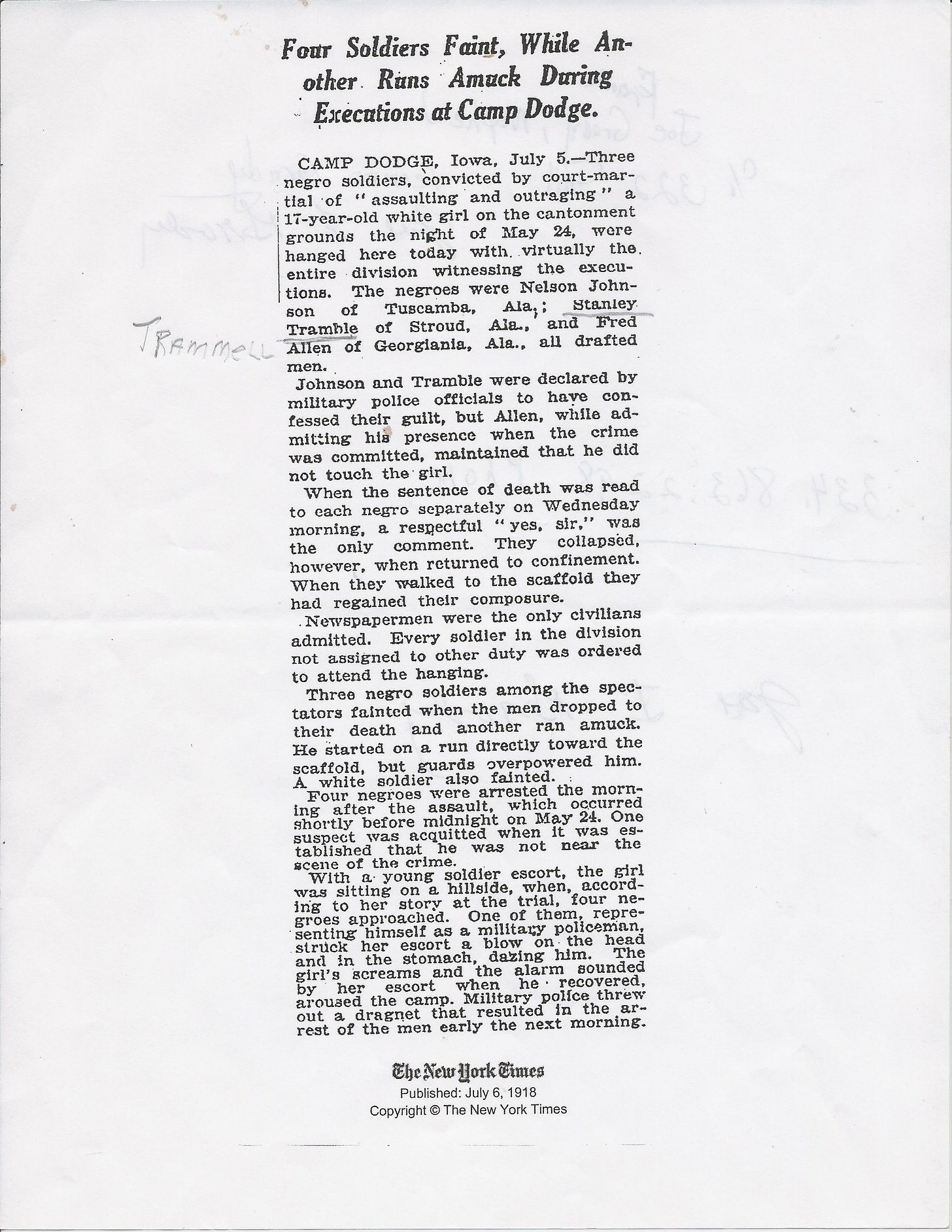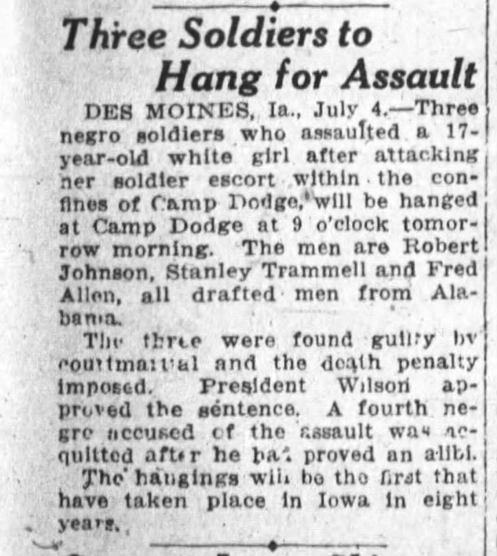 Archival newspaper reports from July 1918 confirm that a soldier identified as “Stanley Tramble” of Stroud, Alabama was executed by hanging at Camp Dodge, Iowa following a United States Army court-martial.